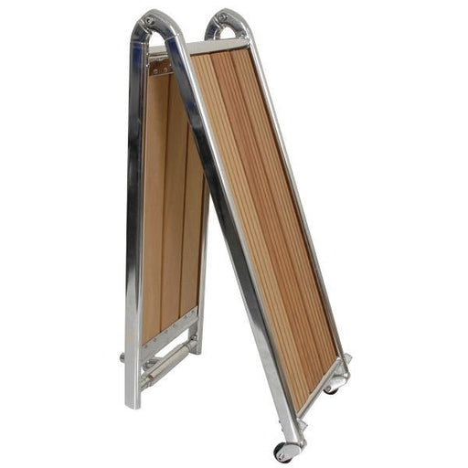 Kort Beskrivning: Snygg landgång i AISI 316 högglanspolerat rostfritt stål. Ovala rör för extra styrka och Iroko-teak.Beskrivning: · Gjutna gångjär...